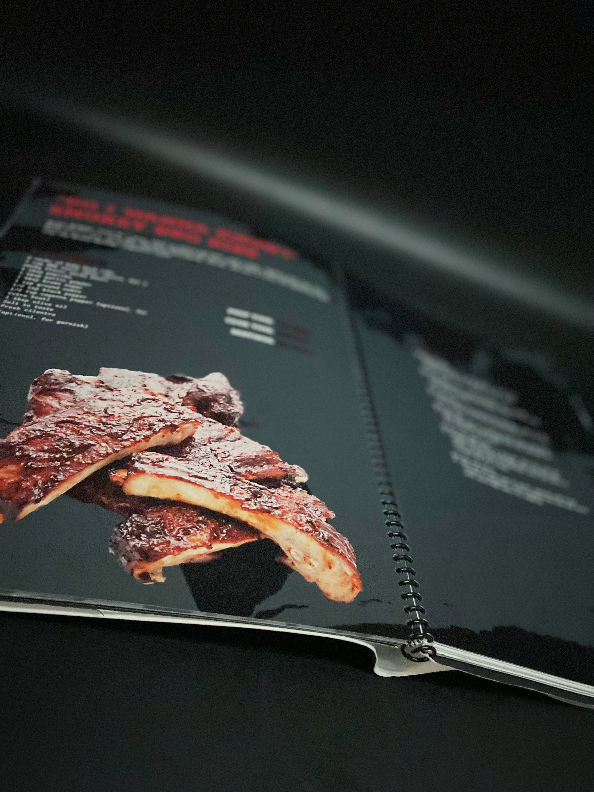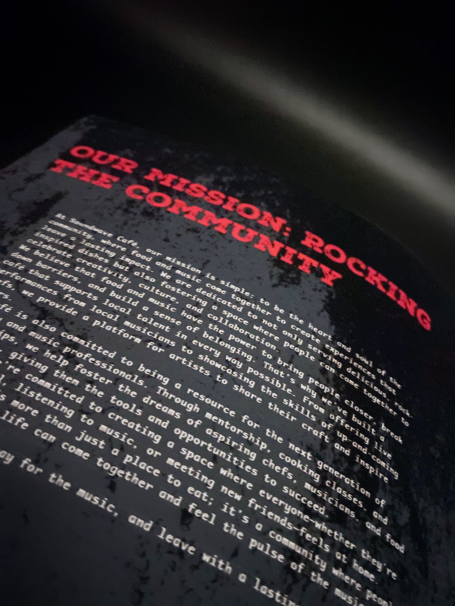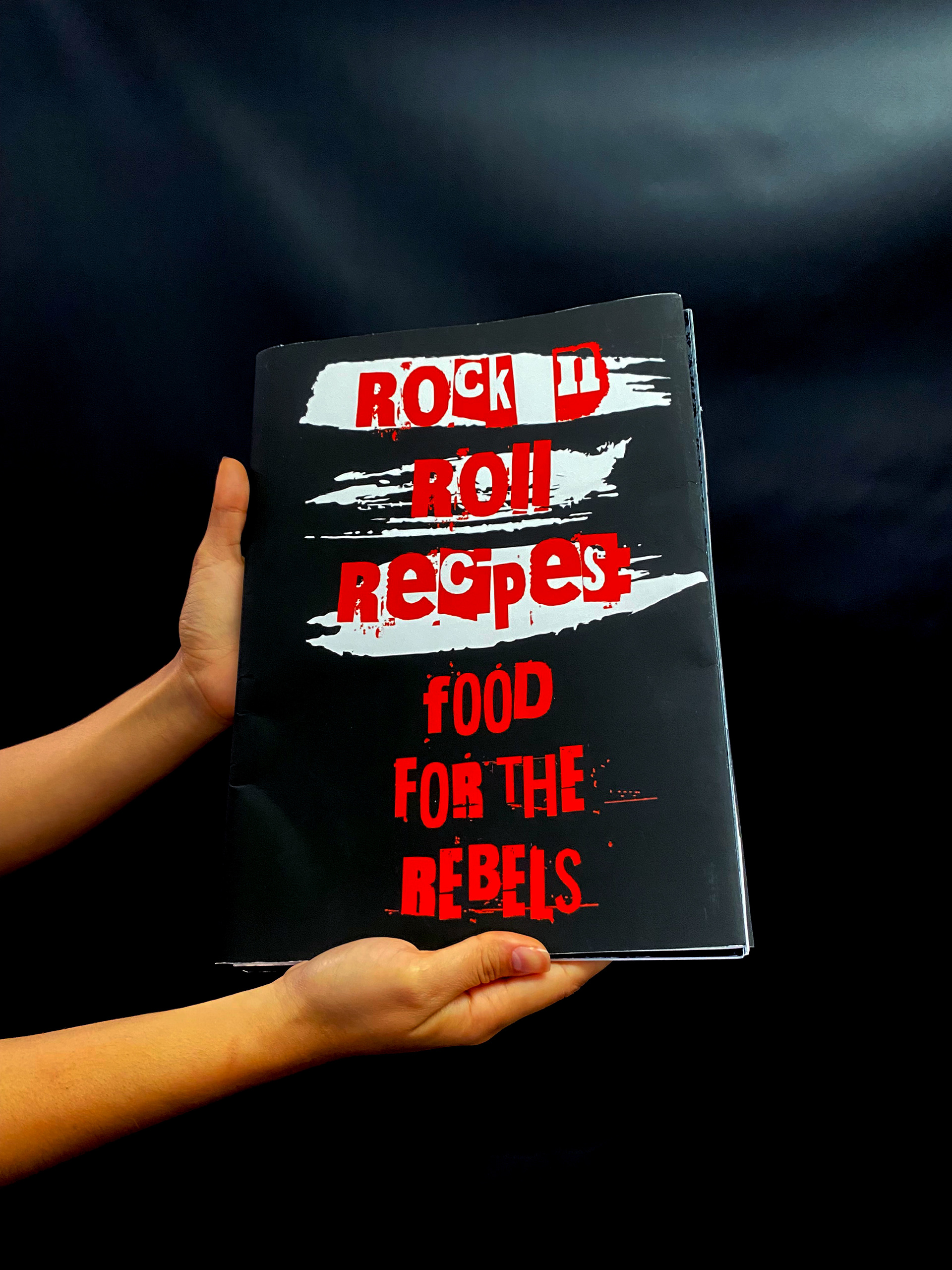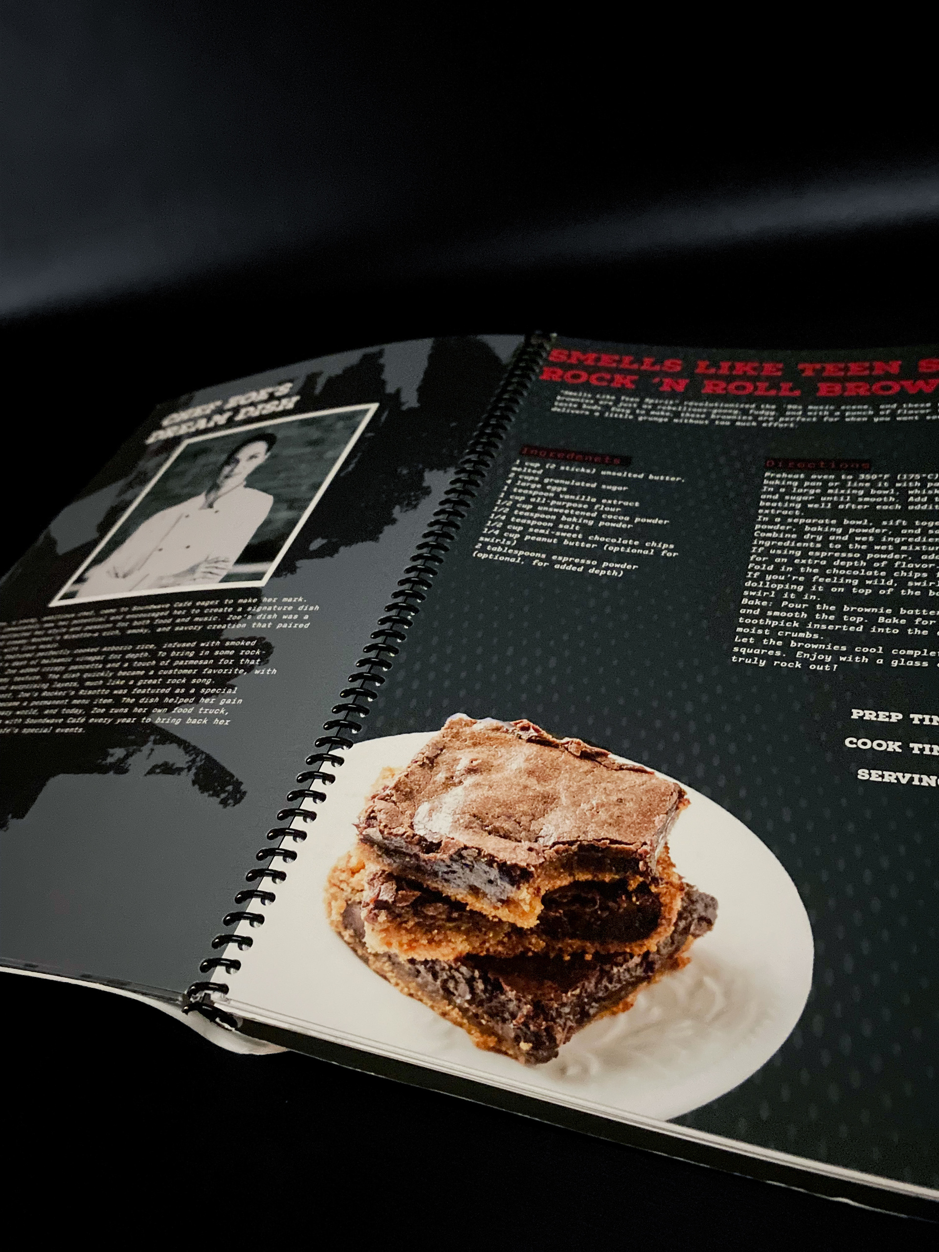 I reimagined a rock and roll themed cook book as a spiral-bound book that feels energetic, bold, and full of personality—just like the music that inspired it. The story behind the concept centers on a restaurant owner who supports employees chasing their dreams, whether they want to become rockstars or chefs. I wanted the design to reflect that rebellious yet supportive spirit, blending gritty textures, dynamic typography, and playful details to create a sense of movement and authenticity throughout the book.