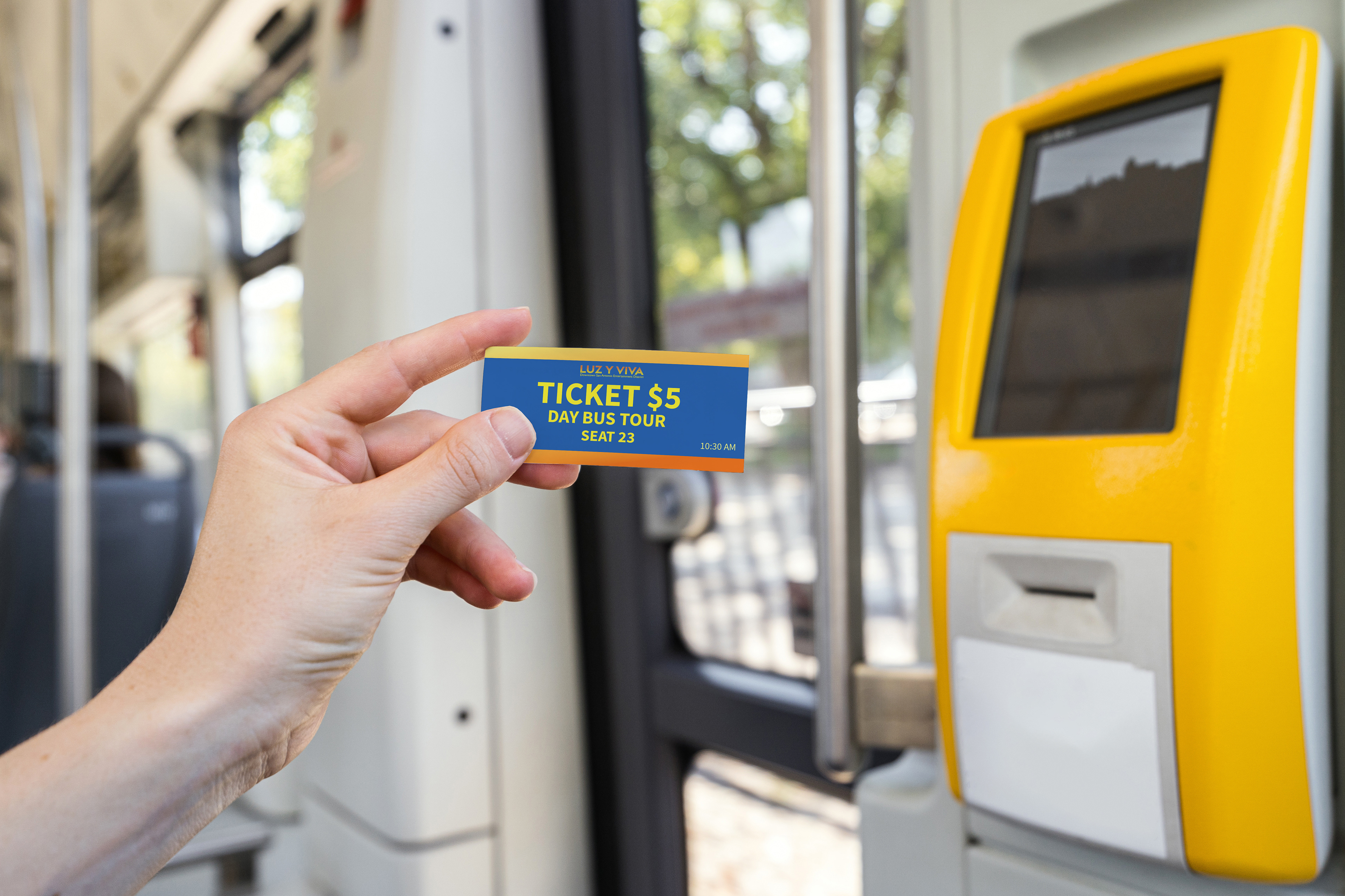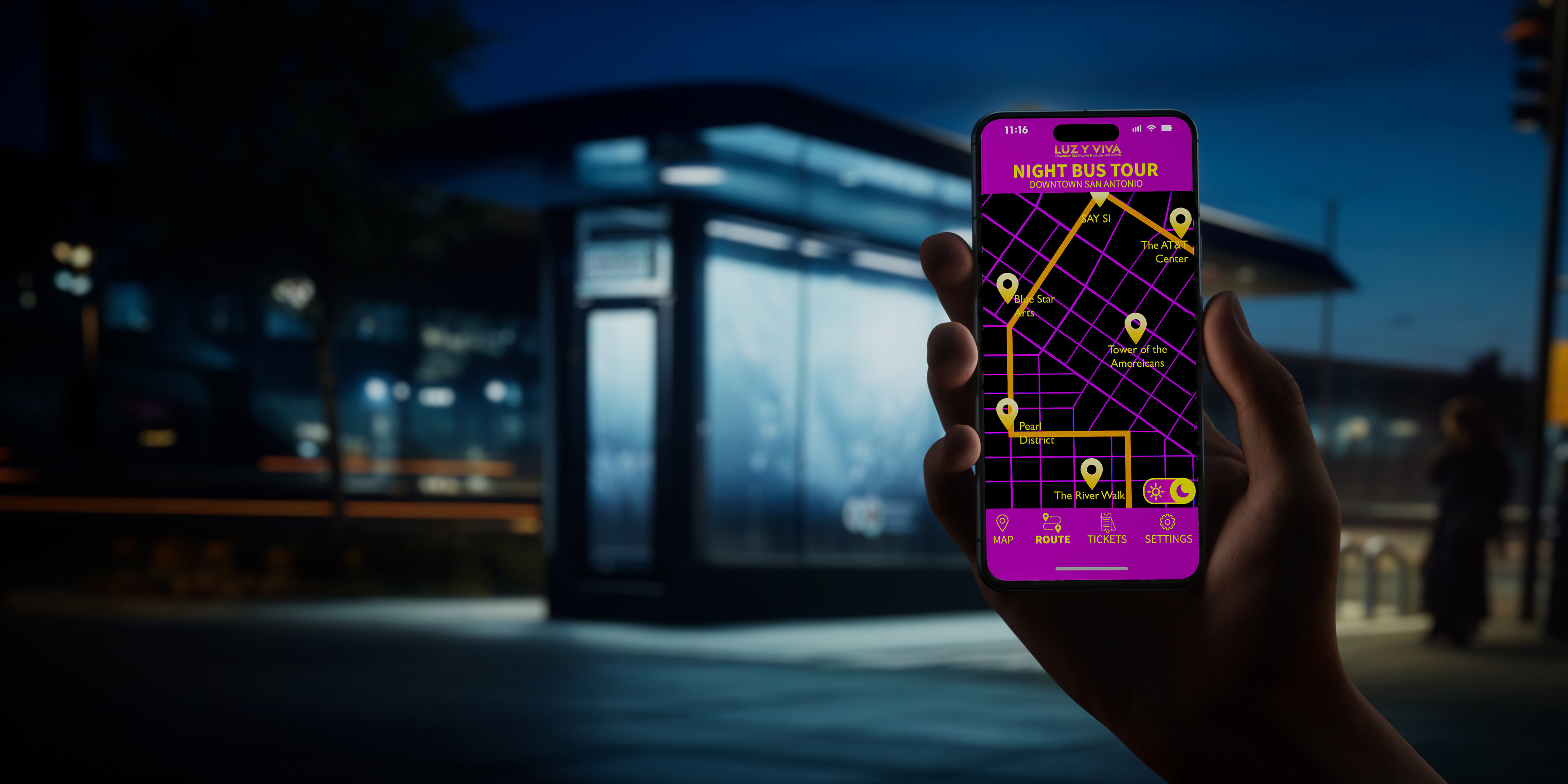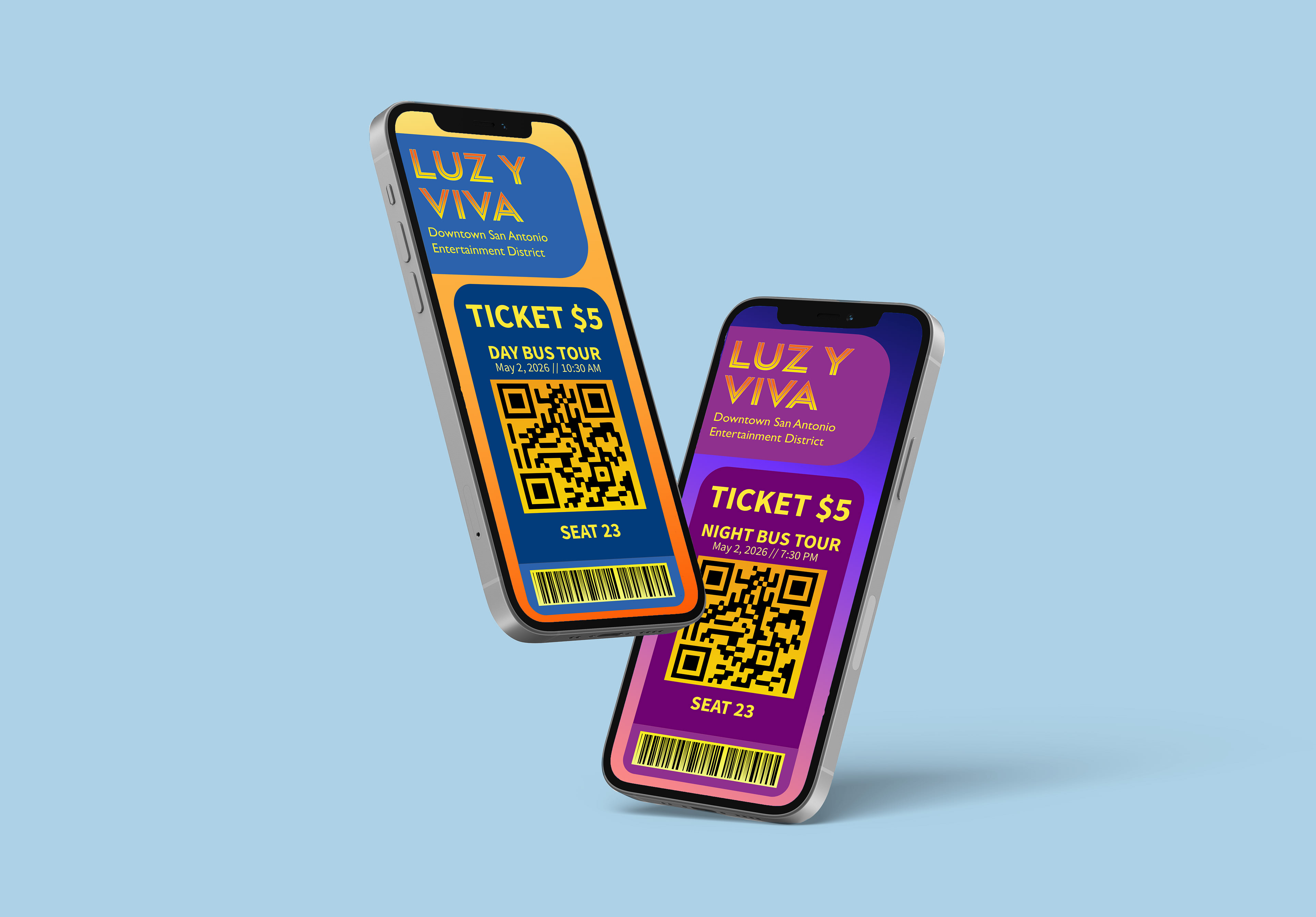 Luz Y Viva (Light and Life) is an interactive cultural transit experience designed to celebrate the art, history, and vibrancy of San Antonio. Through a dual-mode bus system, immersive app interface, collectible ticketing, and curated merchandise, the event transforms city exploration into a dynamic journey of light and life. The system bridges digital and physical experiences to deepen engagement with the city's artistic identity.